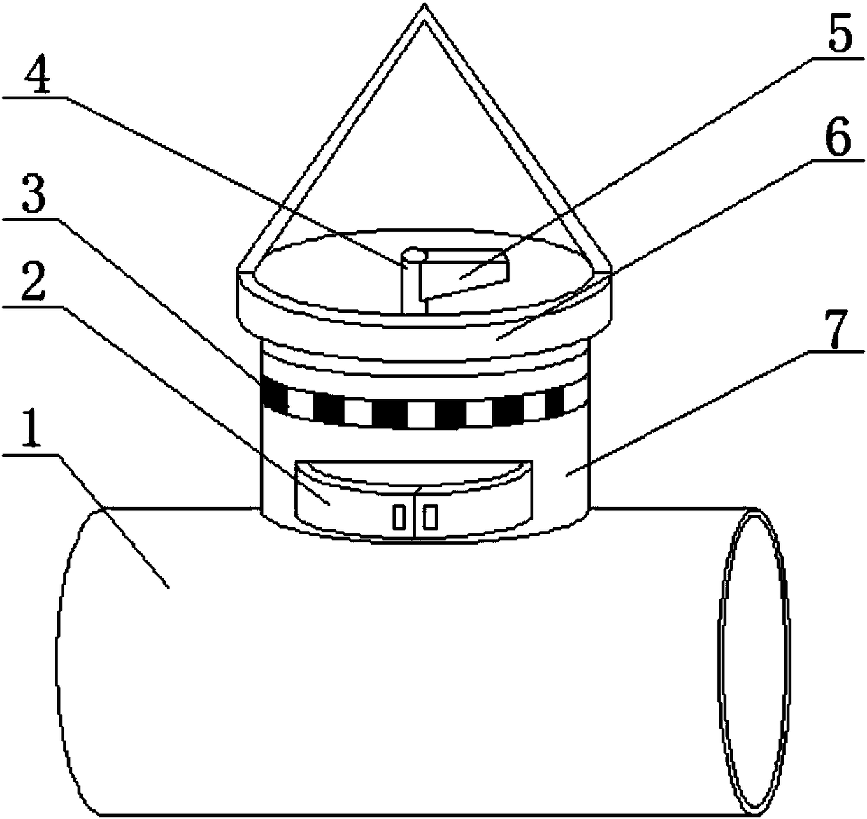 - 项目简介 本实用新型公开了一种污水管网流向判断检测装置,属于污水处理技术领域,包括连接管及螺纹连接于连接管的检测管,检测管与连接管之间固定有密封圈,连接管与检测管之间围成容纳空腔,容纳空腔的内部设有导流块,导流块的侧壁设有导流槽,导流块连接于转轴,转轴贯穿于所述检测管,检测管与转轴之间设有滚轮,转轴通过滚轮转动连接于检测管,转轴的侧壁设有永磁铁,转轴的顶端安装有方向标,检测管的侧壁设有LED灯,LED灯与接线箱电性连接,检测管与防护壳螺纹连接,防护壳与检测管之间设有密封圈,防护壳的内侧设有线圈,线圈与接线箱电性连接。本实用新型的污水管网流向判断检测装置能准确直观的检测污水在管道中的流向。