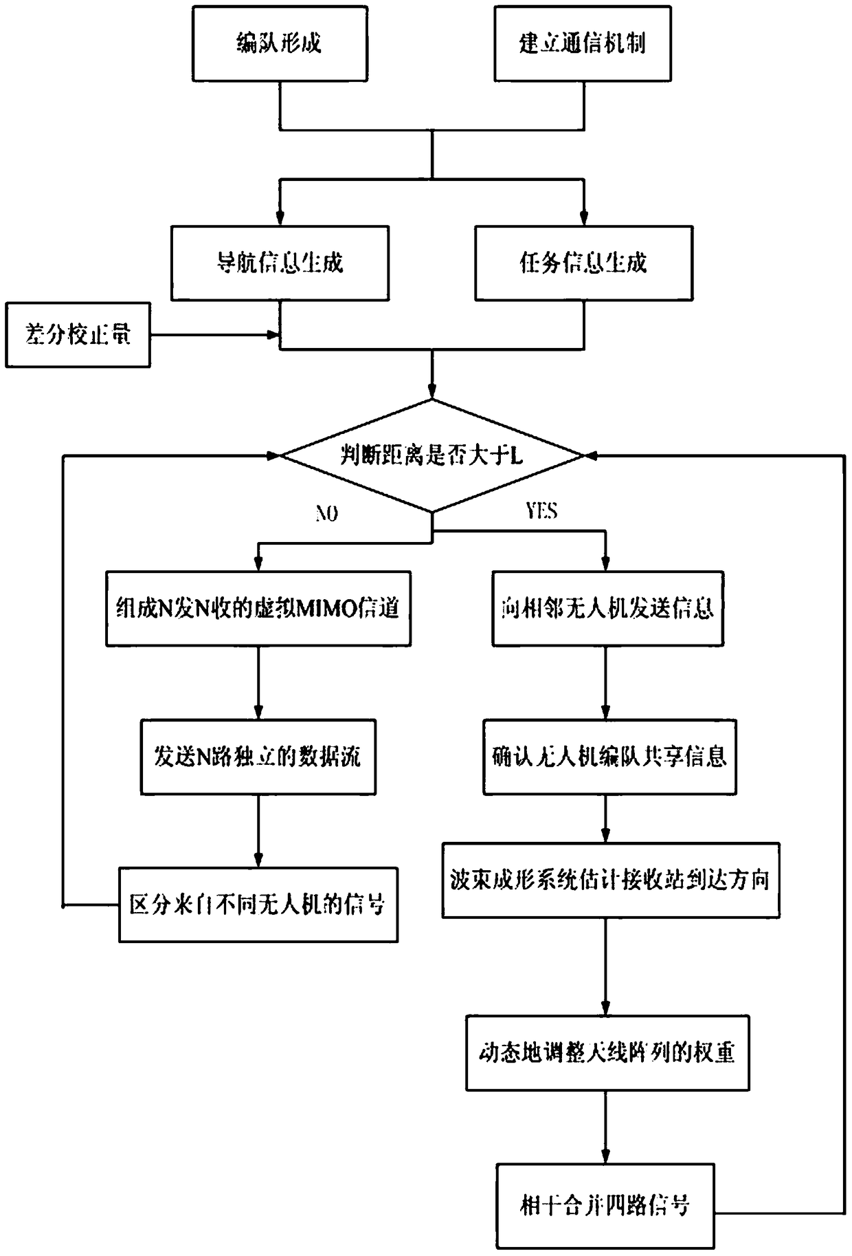 - 项目简介 本发明公开了一种无人机编队分布式协作通信方法,其包括以下步骤:无人机组成编队并建立通信机制;无人机编队在飞行时保持阵形不变并获得导航信息和目标信息;当无人机编队与地面移动接收站的距离小于L时,无人机编队构成一个虚拟的多天线阵列,无人机编队与地面移动接收站利用虚拟MIMO技术进行通信;当无人机编队与地面移动接收站的距离大于L时,无人机编队构成一个虚拟的多天线阵列进行协作通信,共享所获取的导航信息和目标信息,无人机编队采用波束成形技术向地面移动接收站发送信息。本发明的有益之处在于:不仅能够提高无人机编队无线通信网络的传输速率以及时变信道的传输可靠性,而且能够扩大无线网络的传输距离和覆盖范围。