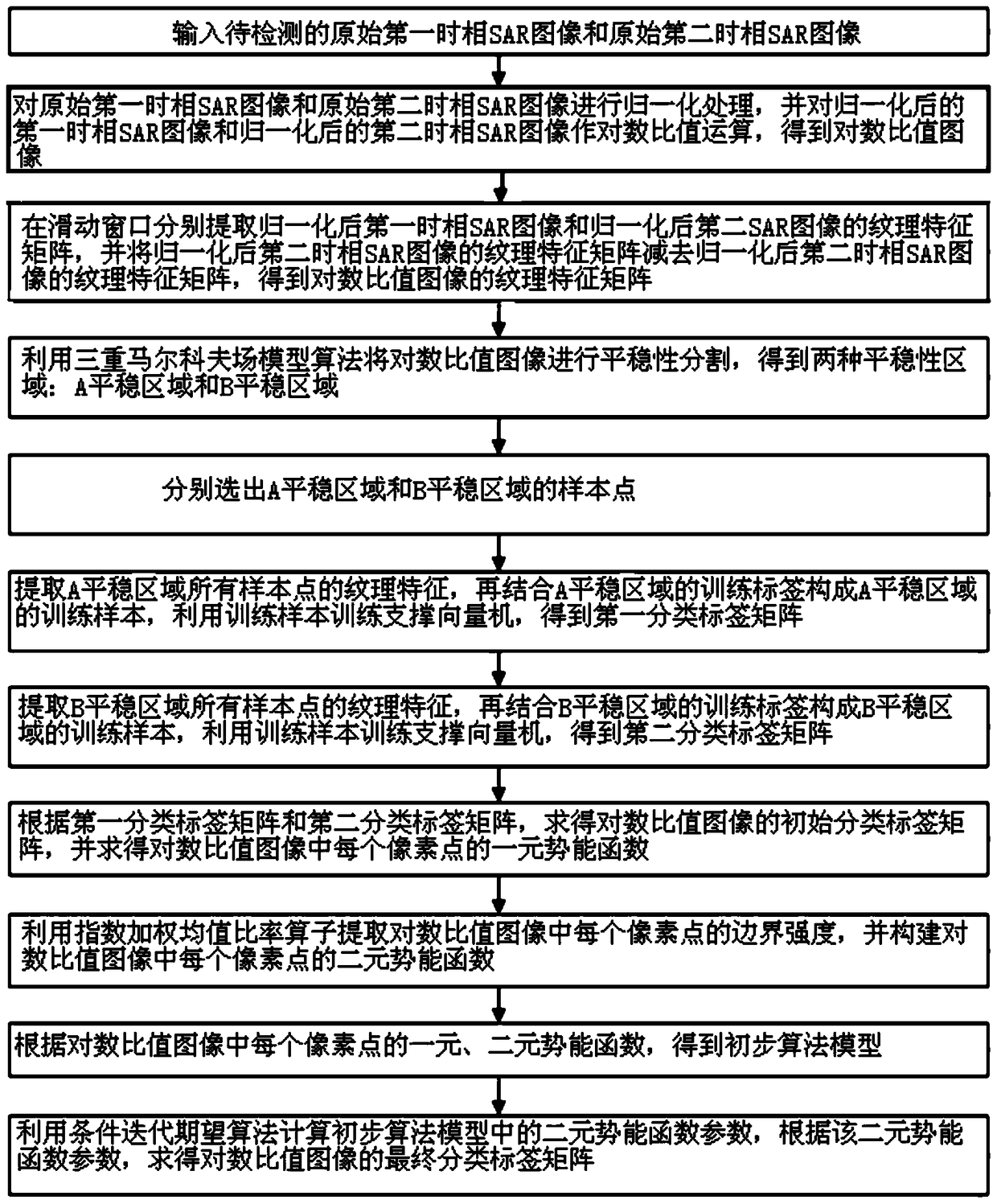 - 项目简介 本发明公开了一种基于非平稳分析与条件随机场的SAR图像变化检测方法,包括以下步骤:(1)对原始第一、第二时相SAR图像分别进行归一化处理,再作对数比值运算,得到对数比值图像,并求取对数比值图像的纹理特征矩阵;(2)将对数比值图像进行平稳性分割,得到A、B平稳区域,构建A、B平稳区域的训练样本,分别利用A、B平稳区域的训练样本训练支撑向量机,得到第一、第二分类标签矩阵;(3)根据第一、第二分类标签矩阵求得对数比值图像的初始分类标签矩阵,并求得对数比值图像中每个像素点的一元势能函数和二元势能函数,进而得到初步算法模型,再计算初步算法模型中的二元势能函数参数,进而求得对数比值图像的最终分类标签矩阵。