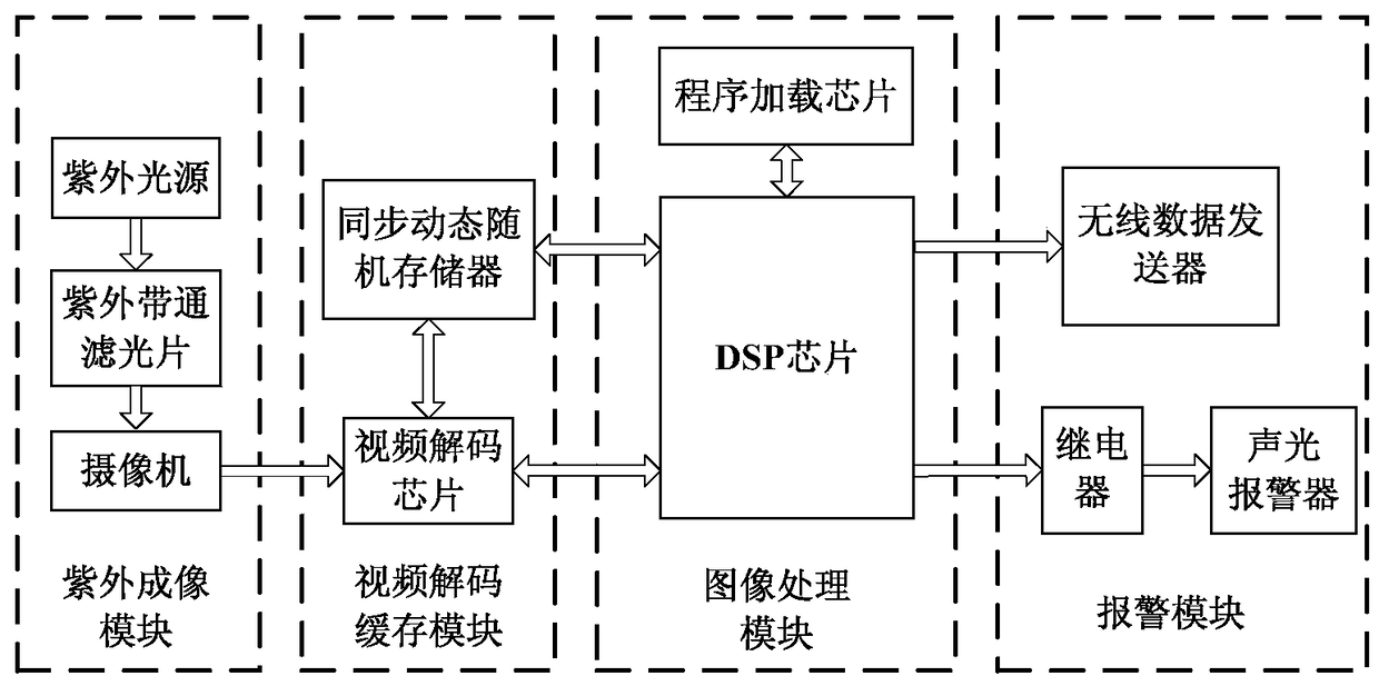- 项目简介 本发明公开了一种基于紫外图像的水面溢油检测系统及方法,涉及信号处理领域。包括顺次连接的紫外成像模块、视频解码缓存模块、图像处理模块、报警模块;紫外成像模块包括紫外光源、紫外带通滤光片和摄像机;视频解码缓存模块包括视频解码芯片和同步动态随机存储器,摄像机与视频解码芯片连接,视频解码芯片与同步动态随机存储器连接;图像处理模块包括DSP芯片和程序加载芯片,视频解码芯片、同步动态随机存储器、程序加载芯片均与DSP芯片连接;报警模块包括继电器、声光报警器和无线数据发送器,DSP芯片通过继电器与声光报警器相连,DSP芯片通过网络接口与无线数据发送器连接。本发明对水面溢油的检测效果较好,抗干扰能力较强。