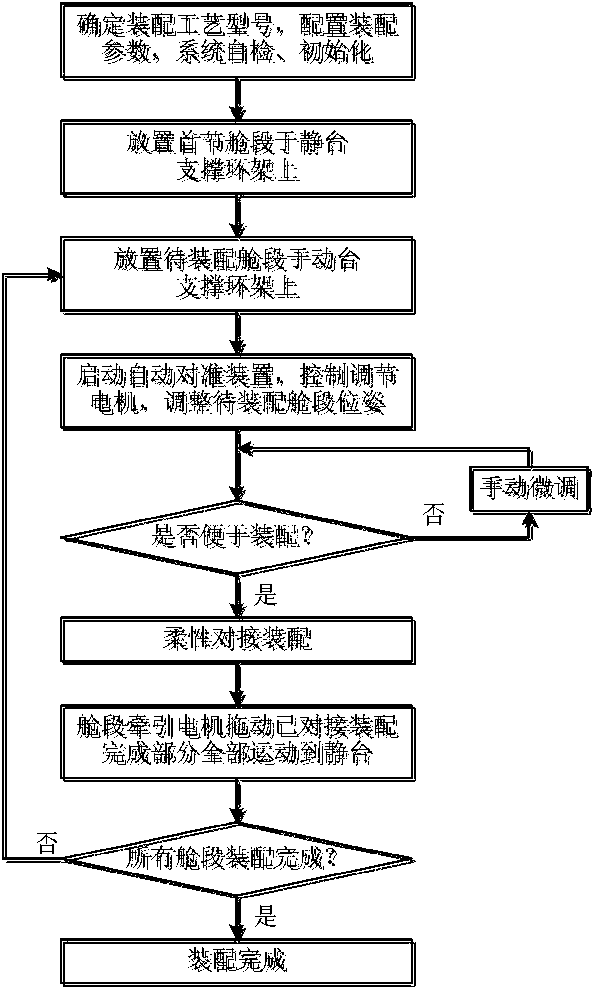 - 项目简介 本发明公开了一种圆柱形舱段柔性对接装置的控制系统及方法,首先确定圆柱形舱段柔性对接装配的工艺型号,配置装配参数,进行自检和初始化,使各装配机构运动到预设位置;放置首节舱段于静台支撑环架上;放置待装配舱段于动台支撑环架上;启动自动对准装置,调整位于动台上的待装配舱段位姿,使其与处于静台上的已装配舱段达到预装配状态;观测是否便于装配,若不便装配,手动微调,直至便于装配为止;柔性对接装配;舱段牵引电机拖动已对接装配完成部分沿舱段轴向全部运动到静台;判断所有舱段是否全部安装完成。本发明解决了现有装配过程中工人劳动强度大,装备的自动化程度低,完全靠工人的经验进行装配的问题,实现了柔性工装自动化。
