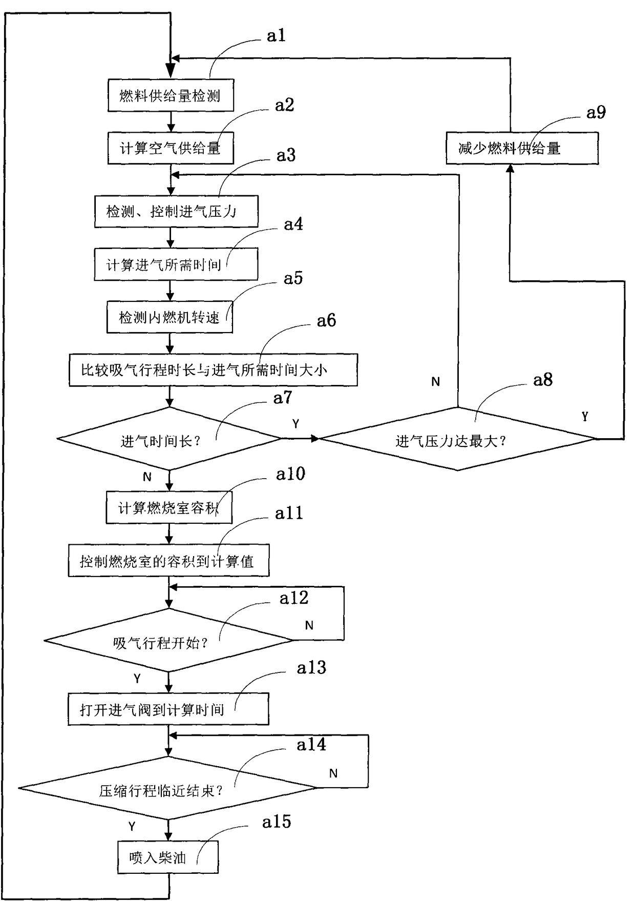 - 项目简介 本发明涉及一种动态改变燃烧室容积的活塞式内燃机控制方法,其根据燃料供给量的变化而动态改变燃烧室容积,其基于吸气行程小于排气行程的理论实现,其过程为:步骤a,检测、计算、核定控制量:检测燃料供给量,根据点燃时的固定的空燃比,计算、核定所需空气总量;步骤b,计算、控制燃烧室的容积:根据上述空气供给量,结合空气压缩比,计算并控制燃烧室的容积,以获得最大点燃初始压力;步骤c,控制进入的空气总量。本发明随燃料供给量的变化而动态改变燃烧室容积的内燃机控制过程,获得吸气行程小于排气行程的活塞式内燃机循环理论应用时的极值参数,该控制充分地利用了燃料的化学能,获得了最大的燃烧效率。