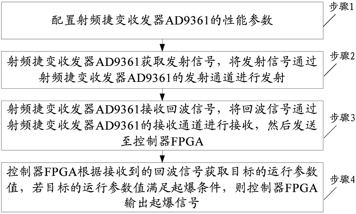 - 项目简介 基于射频捷变收发器的雷达引信及其设计方法。本发明属于无线电技术领域,公开了一种基于射频捷变收发器AD9361的雷达引信及其设计方法,包括:配置射频捷变收发器AD9361的性能参数;射频捷变收发器AD9361获取发射信号,将发射信号通过射频捷变收发器AD9361的发射通道进行发射;射频捷变收发器AD9361接收回波信号,将回波信号通过射频捷变收发器AD9361的接收通道进行接收,然后发送至控制器FPGA;控制器FPGA根据接收到的回波信号获取目标的运行参数值,若目标的运行参数值满足起爆条件,则控制器FPGA输出起爆信号,可广泛应用于起爆时机的控制、选择最佳的攻击点、按照预定策略完成起爆控制。