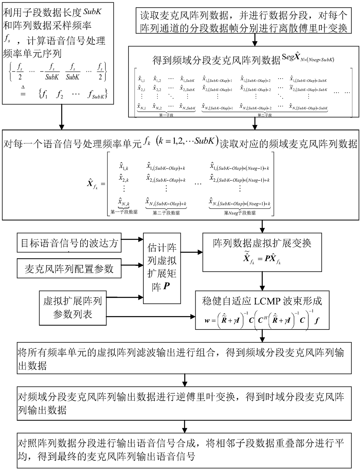 - 项目简介 基于阵列虚拟扩展的麦克风阵列空域滤波方法,步骤为:获取频域分段麦克风阵列数据;计算语音信号处理的频率单元序列;组成与频率单元序列对应的频域麦克风阵列数据;构造目标语音信号的阵列导向矩阵及虚拟扩展阵列导向矩阵;估计阵列虚拟扩展矩阵;对频率单元序列对应的阵列数据进行虚拟扩展变换;对虚拟扩展阵列对应的阵列数据进行稳健自适应波束形成;将虚拟扩展阵列输出按照频域分段麦克风阵列数据格式进行组合,得到频域分段麦克风阵列输出数据;对频域分段麦克风阵列输出数据的每一子段数据进行逆傅里叶变换,得到时域分段阵列处理语音信号;进行输出语音信号合成,将相邻子段数据重叠部分进行平均,得到最终的麦克风阵列输出语音信号。