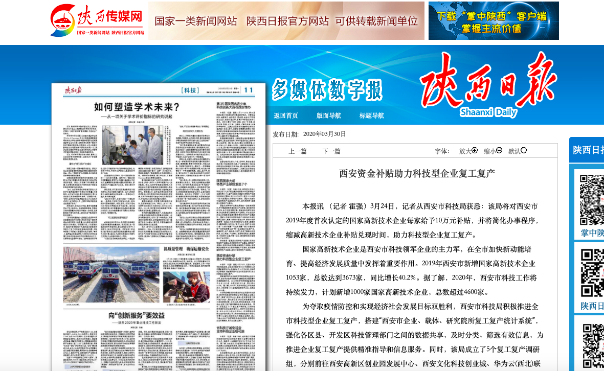 陕西日报:西安资金补贴助力科技型企业复工复产